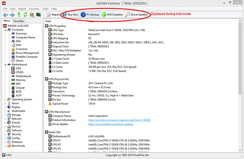On the left you have two tabs. The menu and favorites. They are pretty much self-explanatory. Each section in the menu has a triangle to expand and reveal additional features. On the screenshot above, I am displaying the CPU information under the Motherboard menu. Here it shows different attributes of my CPU. I used to have to install CPU-Z to get such information, now I don’t have to since it’s included with Aida64. Also in the screenshot, you will notice that not all the information is available during the trial but you are still given a lot of functionality.