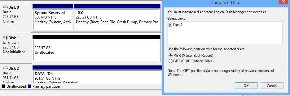 I’ve been running SSD drives for a few years now and never looked back. The performance is night and day. SSDs can make an old computer feel new again (unless the CPU is really old and using the original SATA (1.5Gbps) but I’m sure you’ll feel a difference. A note during installation. It took four restarts before Windows finally recognize the drive. My bios recognized it with no problem. From the looks of it, the drive was originally formatted with GPT – I’m guessing this is why it was difficult for Windows to detect. Here’s a screenshot of Windows when it finally recognized it.