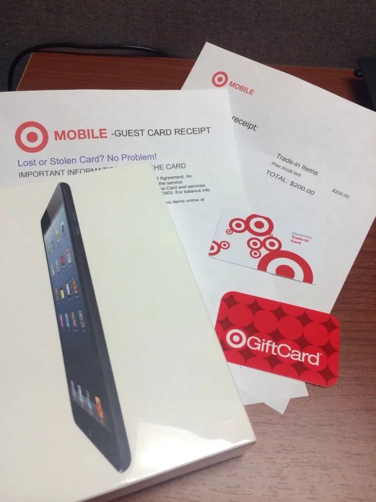 Target gave me 2 documents about the trade-in, the gift card for the value of my iPad, and on top of that Target was giving a $25 gift card with a purchase of an iPad Mini. The trade-in value was already a great deal for a very old iPad but to even sweeten the deal, I got another $25. Also that week, they had 10% off their iTunes gift card. I’m sure they timed every thing together to entice customers more. If you missed out, hopefully they’ll do it again.
