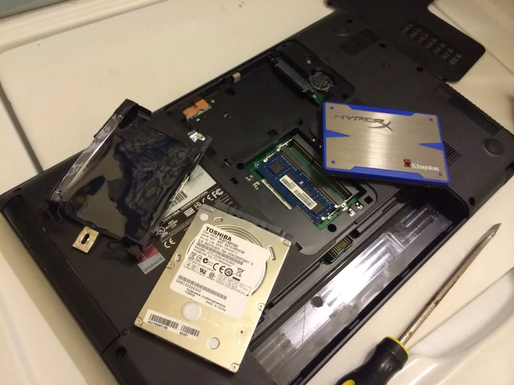 The upgrade is very easy. First, you will need to boot to the desktop. So I had to let the laptop initialize and answer a few questions. Next, I created DVD restore discs using the Toshiba Recovery Media Creator software. This is how I will get the OS onto the new hard drive. Laptops no longer come with restore discs. It’s been this way for many years now. They usually have a hidden partition on the hard drive if the computer needs to be restored. You can also order a copy of the restore discs for around $16. Or, if you’re lucky, the computer comes with software that will allow you to make your own. For this particular laptop, you can use 3x 4GB DVD-R or 16GB+ USB thumb drive. I went with the DVDs and the process took about an hour to create. Make sure you label the DVD discs so you know which goes first, second, and third. When restoring it will ask you for all 3.